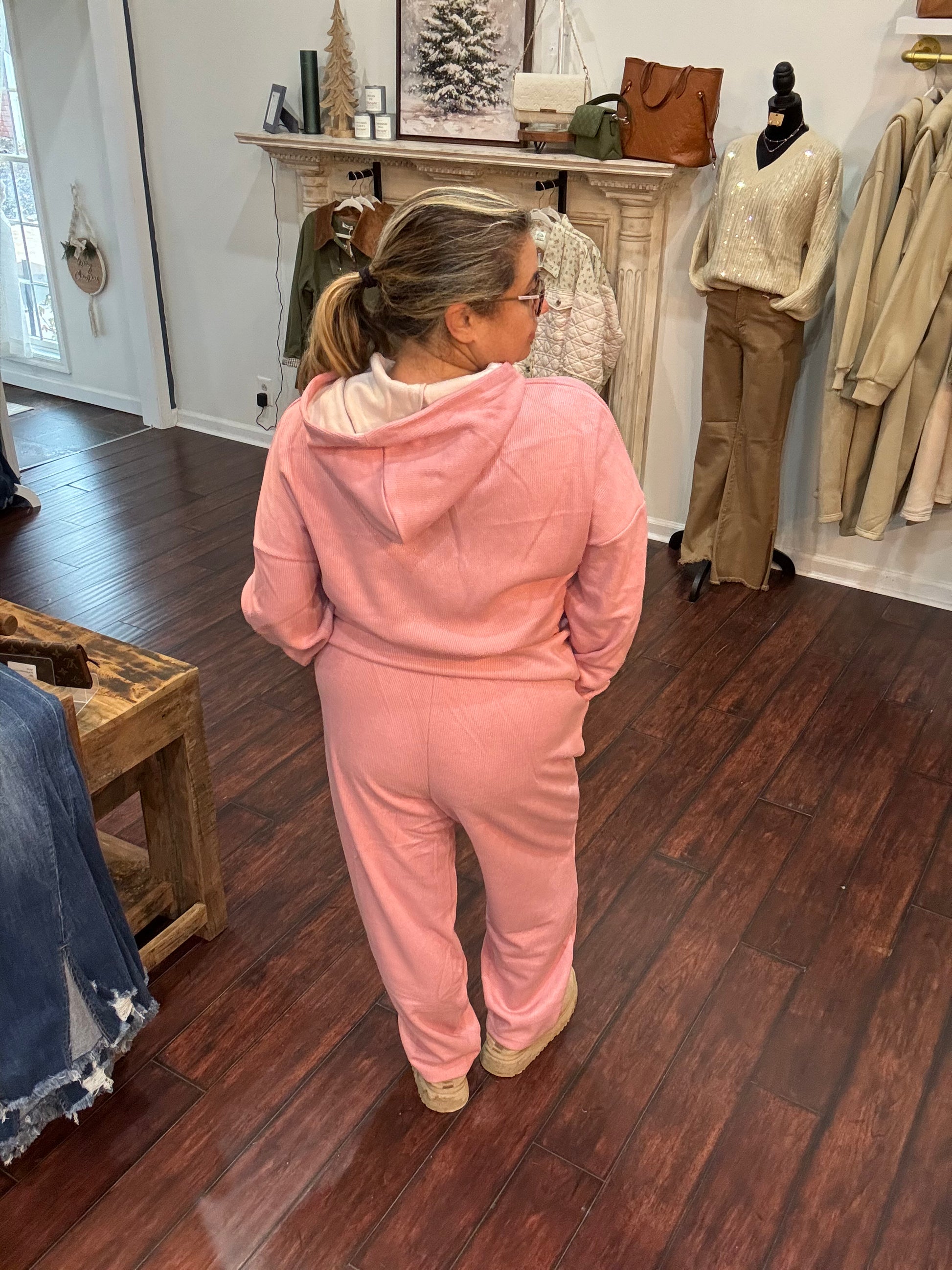 The Blush & Lace Lounge Set is where cozy comfort meets romantic charm. Made in a soft ribbed knit with a relaxed fit, this two-piece set features a hooded pullover with lace drawstrings and matching pants with a coordinating lace tie waist. The dusty blush hue gives it a dreamy, feminine vibe, while the lace details add a delicate touch you’ll love. Perfect for lounging at home, running errands, or styled up for an effortlessly chic casual look.