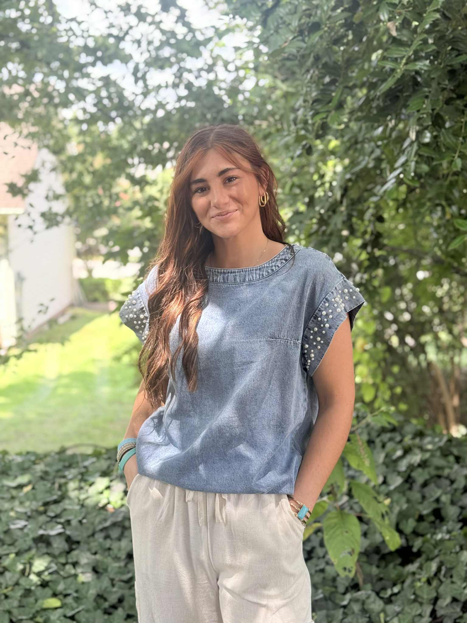 Add a touch of effortless charm to your everyday look with the Coastal Pearl Denim Tee. This washed denim top is perfectly relaxed, featuring playful pearl-embellished sleeves that bring just the right amount of feminine flair. Pair it with white shorts for a beachy vibe or dress it up with skinnies and wedges for an elevated casual look.