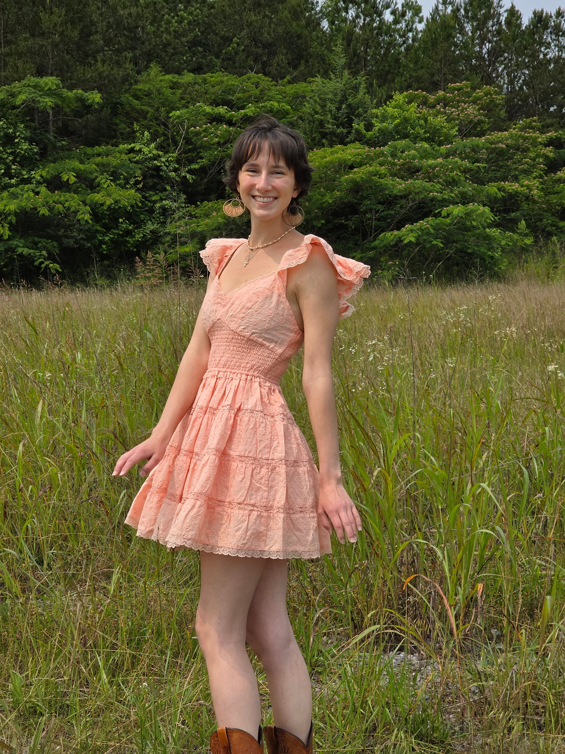 Float through your day in the Coral Cloud Mini Dress – a dreamy, lightweight stunner in soft coral with delicate lace trim. Featuring flutter sleeves, a smocked waist, and tiered skirt with subtle embroidery, this romantic silhouette offers both comfort and charm. Whether you're headed to brunch or a beach date, this dress is your go-to for sweet, sunny style. Pair it with sandals and gold jewelry for a fresh coastal cowgirl vibe.