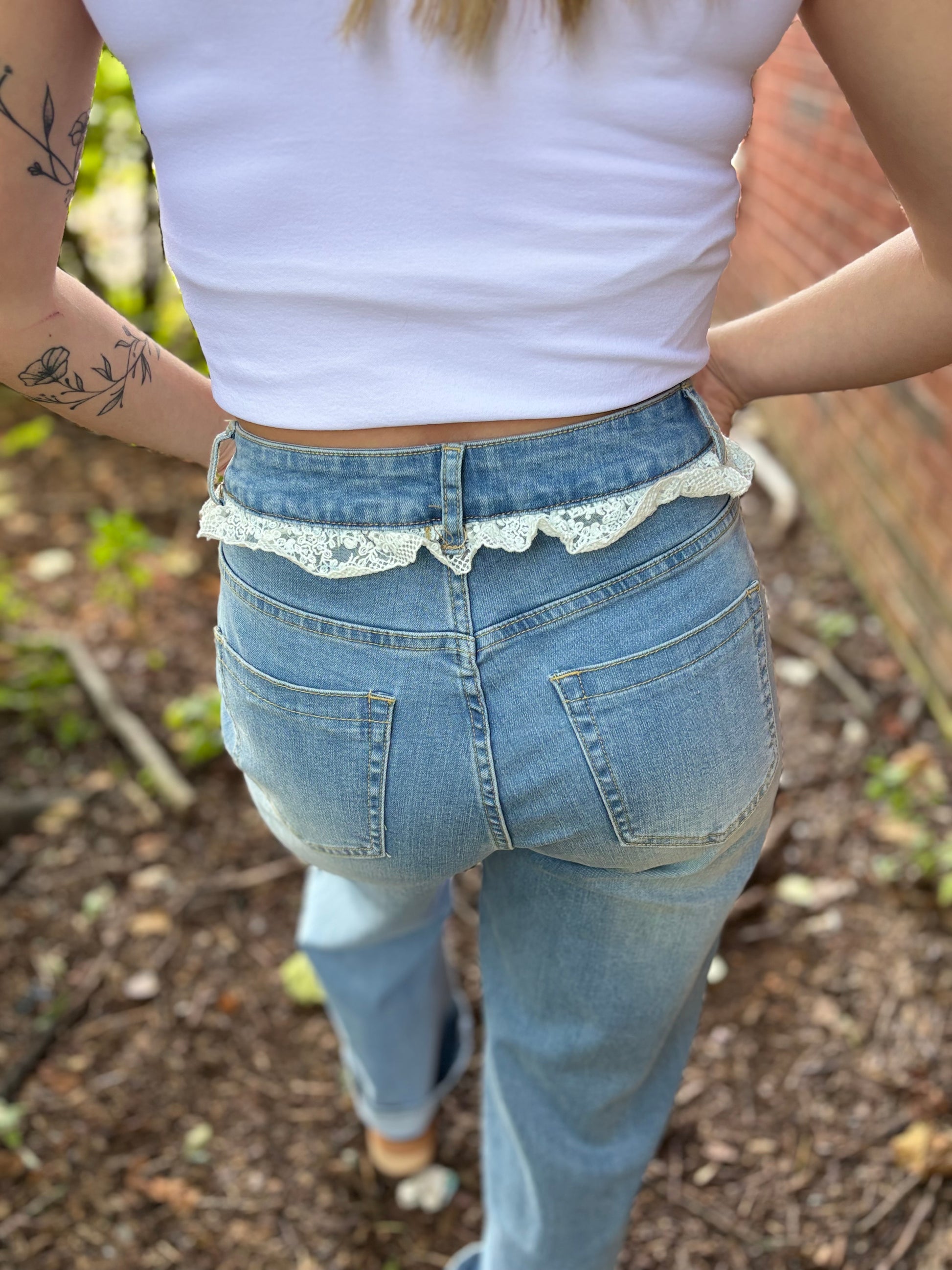 The Lace Whisper High Rise Jeans are where denim meets delicate. Designed with a flattering high-rise straight leg fit, these jeans feature soft lace trim along the pockets and waistband for a feminine twist on a timeless classic. The stretch fabric keeps them comfy while the lace detailing adds that boho-meets-romantic vibe perfect for dressing up or keeping it casual. Pair with a simple tank, a crochet top, or a flowy blouse for a look that’s effortlessly chic.