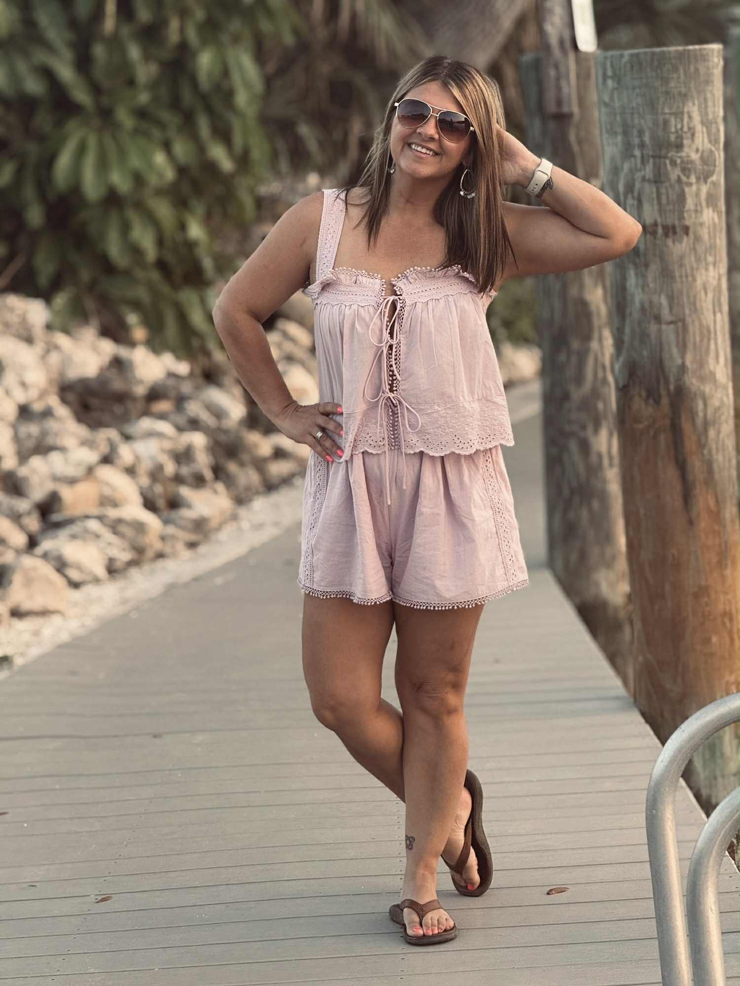Delicate, dreamy, and oh-so-sweet—the Lilac Breeze Eyelet Set is your new go-to for effortless femininity. This pastel two-piece features a soft lilac hue with intricate eyelet embroidery and darling tie-front details on the top. The wide straps and scalloped hem add a vintage-inspired charm, while the matching high-waisted shorts offer an easy fit with a comfy elastic waistband and dainty crochet trim. Whether you’re lounging with a latte or heading out for a picnic, this set is the perfect blend of soft girl energy and relaxed elegance.