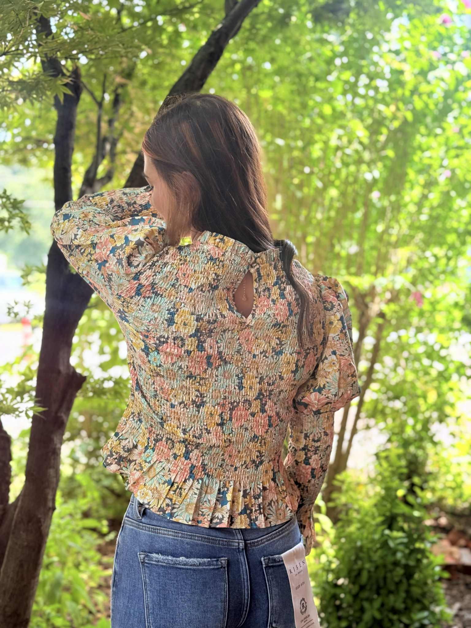 The Meadow Bloom Smocked Top is a fresh and feminine piece made for sunshine days and breezy evenings. Featuring a ditsy floral print in warm, earthy tones with pops of soft blue and coral, this long-sleeve top is designed with a flattering smocked bodice, ruffled neckline, and playful peplum hem. The keyhole button detail at the back adds a sweet finishing touch. Pair it with denim for a casual day out or dress it up with a skirt and boots for that true boho-chic vibe.