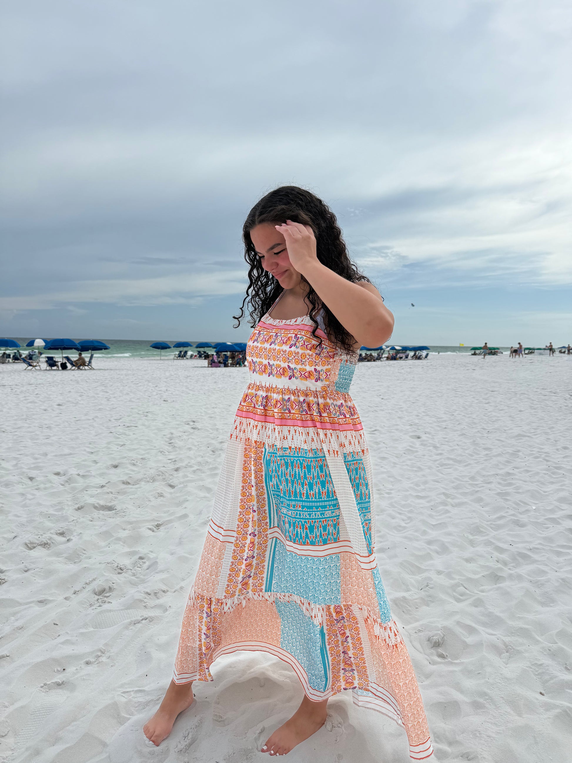 Channel beachy boho vibes with the Sunkissed Shores Maxi Dress – your new summer must-have. Featuring a patchwork-inspired print in warm sand, sunset coral, and seafoam teal tones, this flowy tiered maxi is effortlessly romantic. Designed with delicate spaghetti straps, the back has a smocked bodice for a comfy, flattering fit, and a breezy silhouette that moves with you from beach strolls to sunset dinners. Lightweight, dreamy, and full of wanderlust charm.
