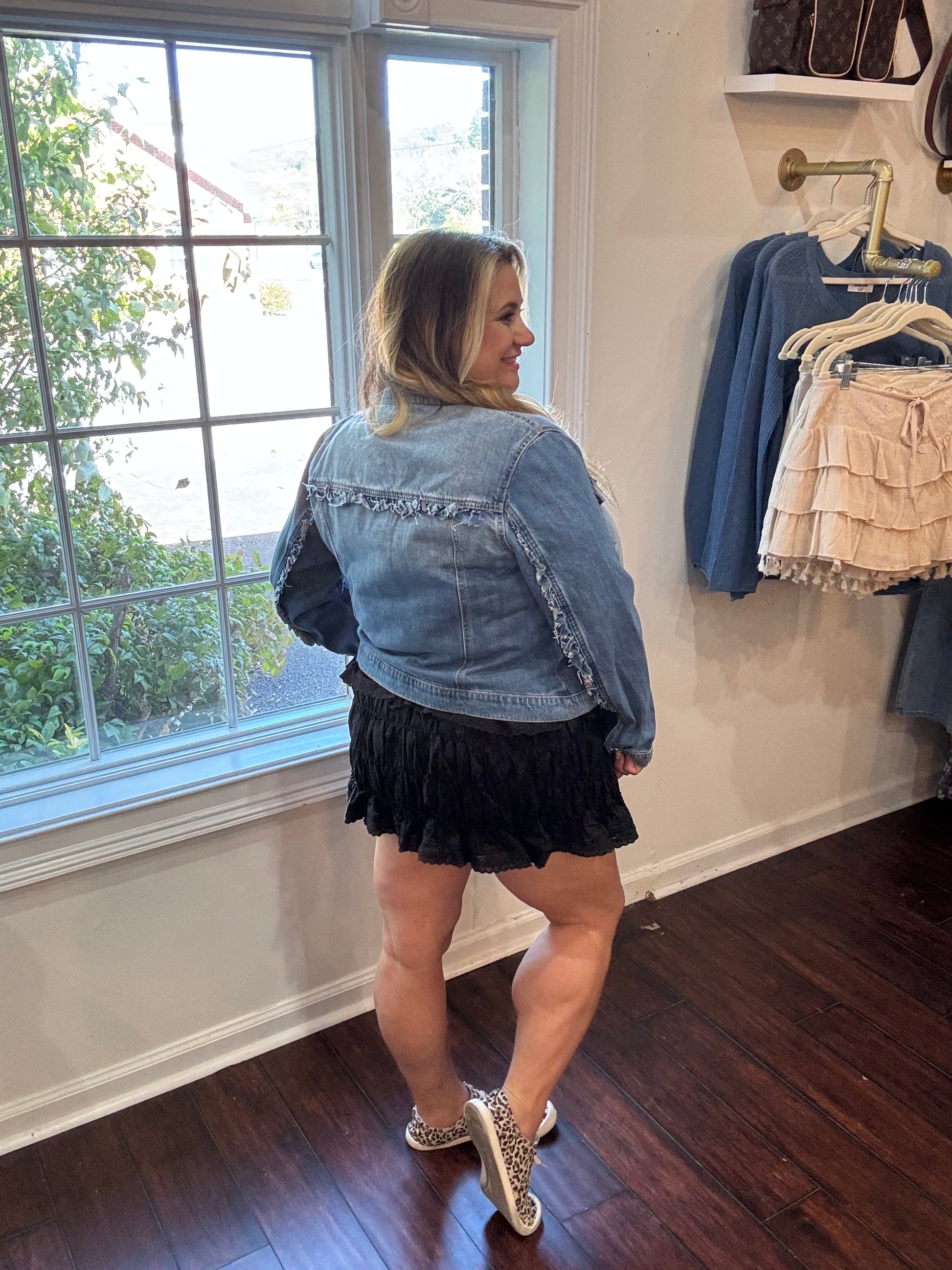 Say hello to your new favorite LBR (little black romper). The Midnight Ruffle Romper features soft tiered ruffles, delicate lace trim, and a low open back with a tie detail that brings all the drama. Bonus: it’s got built-in shorts so you can dance all night with confidence. Pair it with boots, sandals, or heels—this one’s made to steal hearts and turn heads.