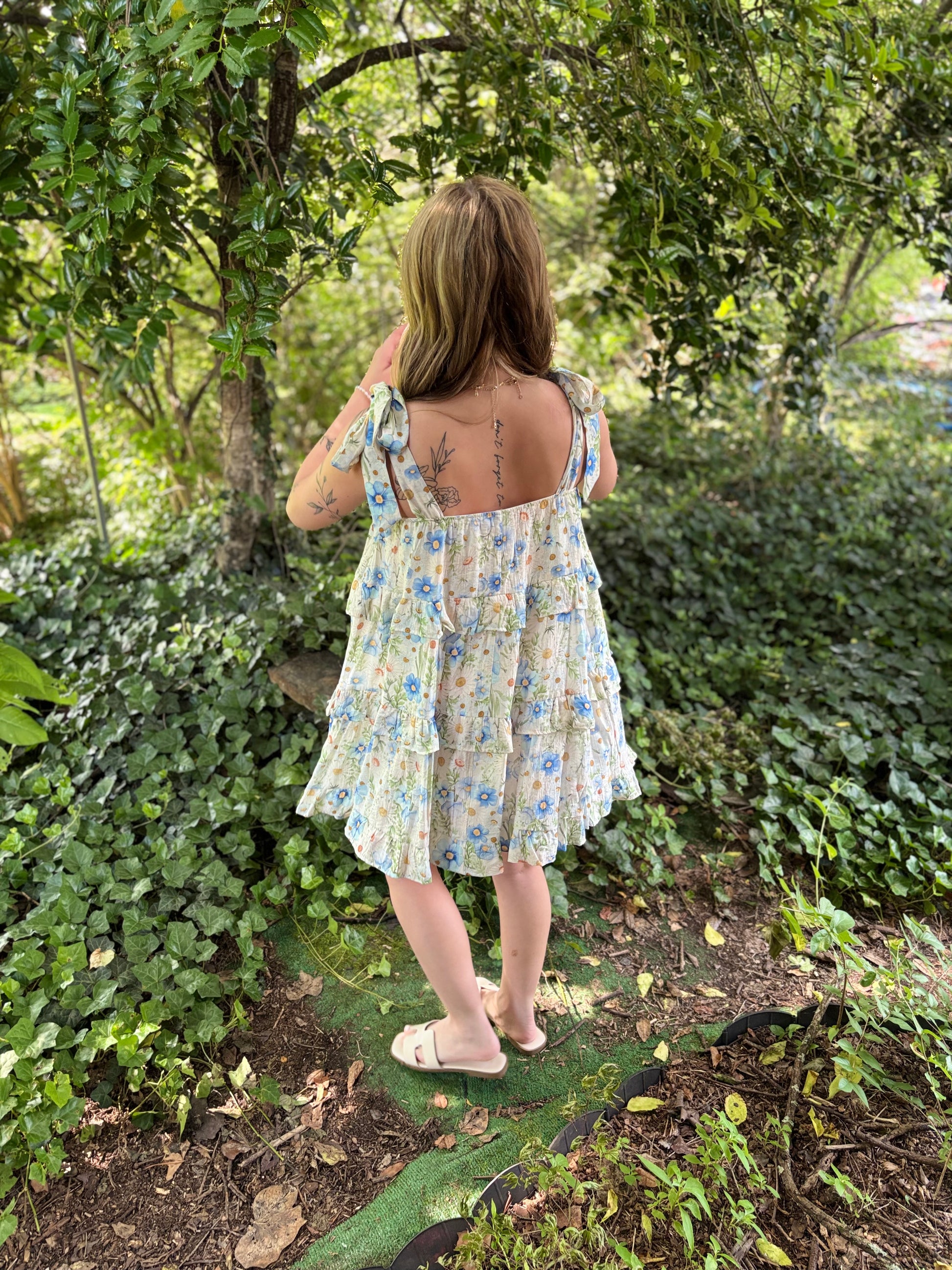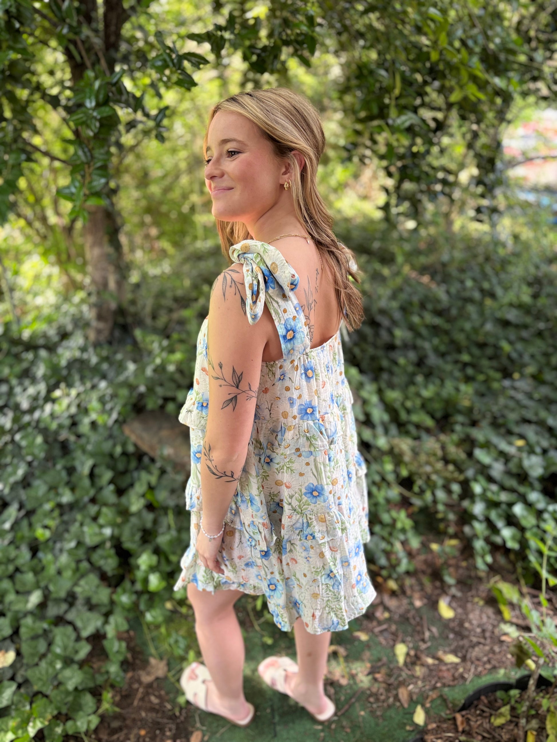 Say hello to sunny days and field-frolicking feels in the Wildflower Wishes Dress. Bursting with soft blue blooms and peachy wildflowers, this tiered mini dress features charming tie straps, a relaxed swing silhouette, and a breezy fabric that’s made for twirling. It's the kind of dress you’ll reach for when you want to feel carefree and cute.